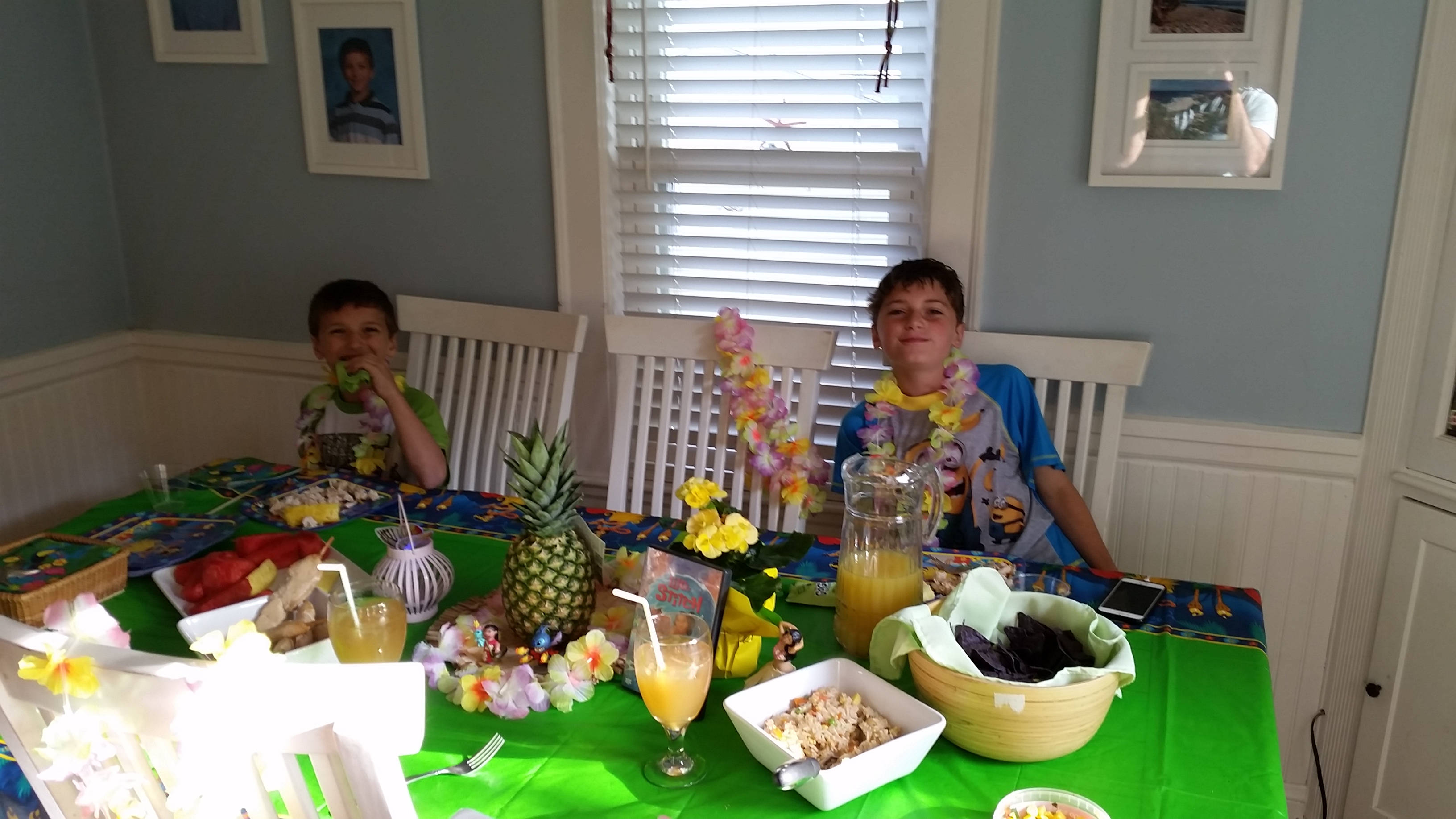 The Changnons didn’t make it over until dessert so it was just the four of us for a little Hawaiian luau of sorts. We had chips with pineapple salsa, chicken skewers, chicken fried rice, pineapple and watermelon. And the kids had Stitch juice to drink. And for dessert (with the Chagnons (please note, yet another use of a parentheses…In fact a parentheses inside a parentheses? Amazetown)) we had coconut cake.