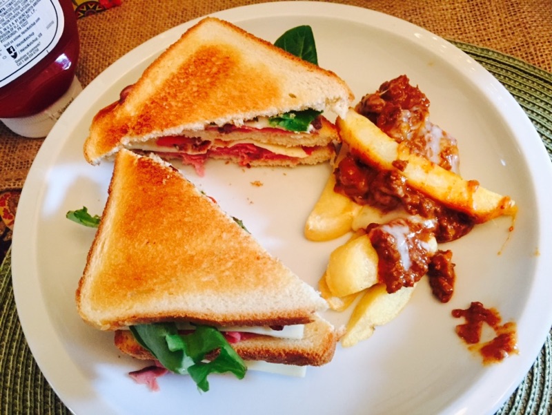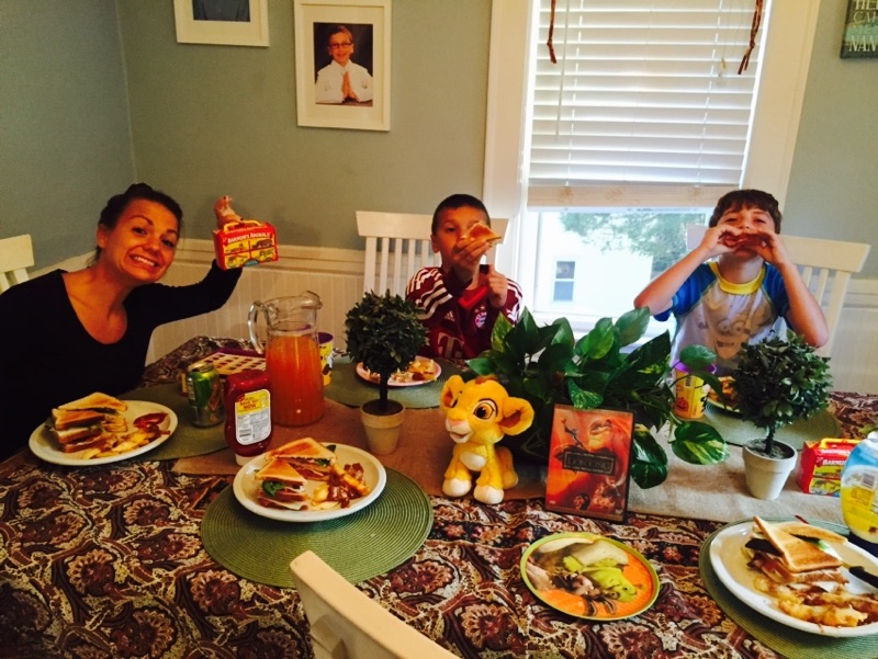Often, when we have done Lion King nights in the past, we have done steak because the supermarket was “fresh out of zebra,” but tonight we tried to do something a little different. For the main course, we had “Make mine a” cub sandwiches – turkey/roast beef club sandwiches. And on the side we had Hakuna Potatoes – French fries with chili and cheese, animal crackers and jungle juice to drink. For dessert? Zebra cakes of course.