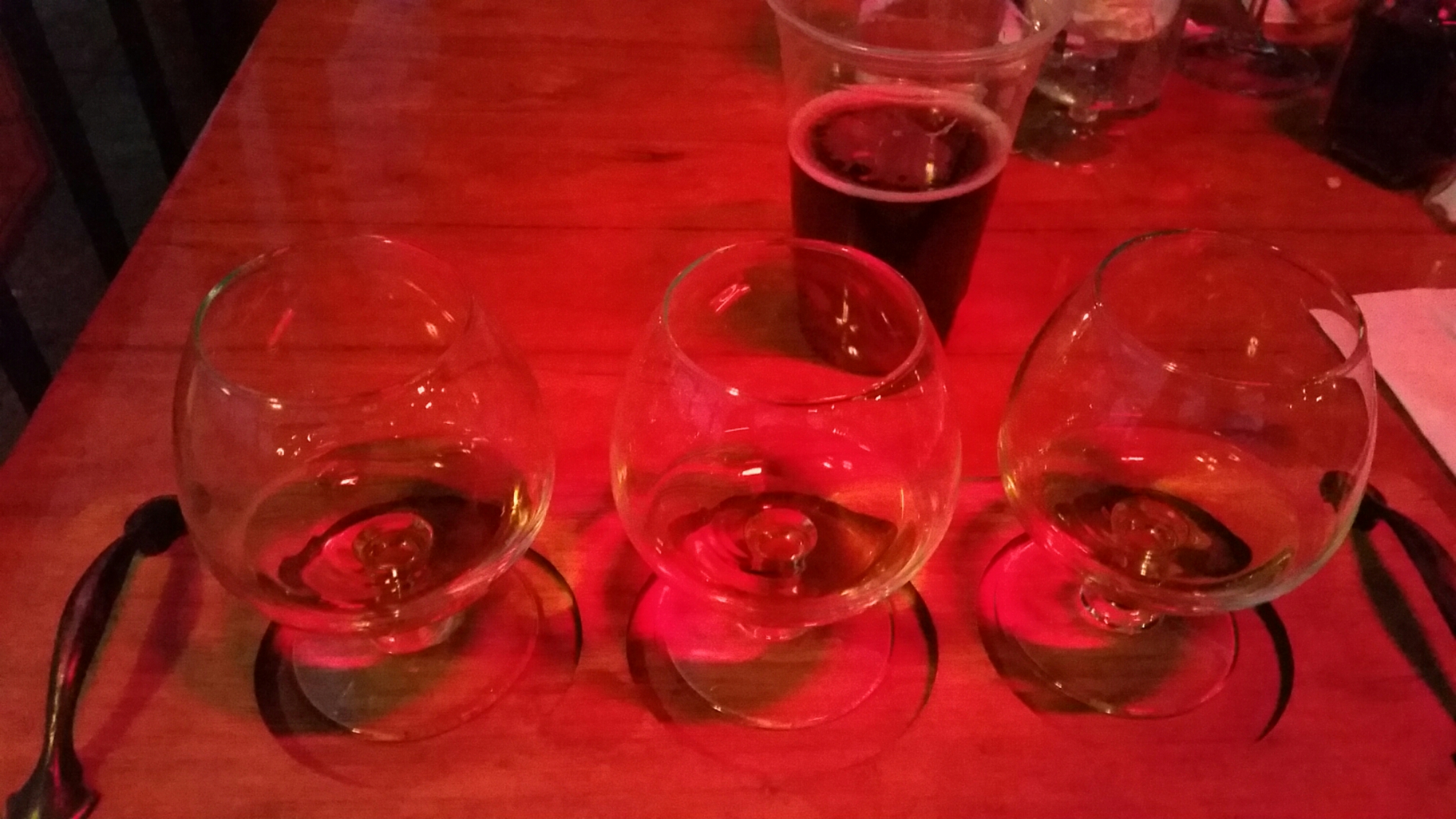 We sit down…the four adults at one table and the four kids at the table right next to us. Nerdy and I order scotch flights. Because of course. And I had a picture of these. But now it is gone. Probably because of scotch. Edit. Here it is.