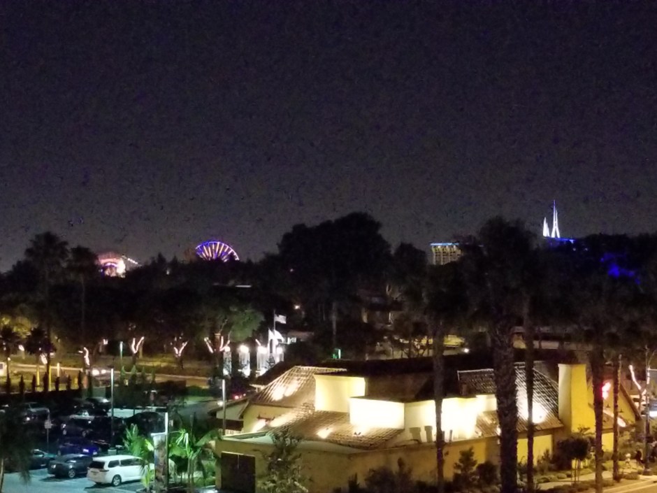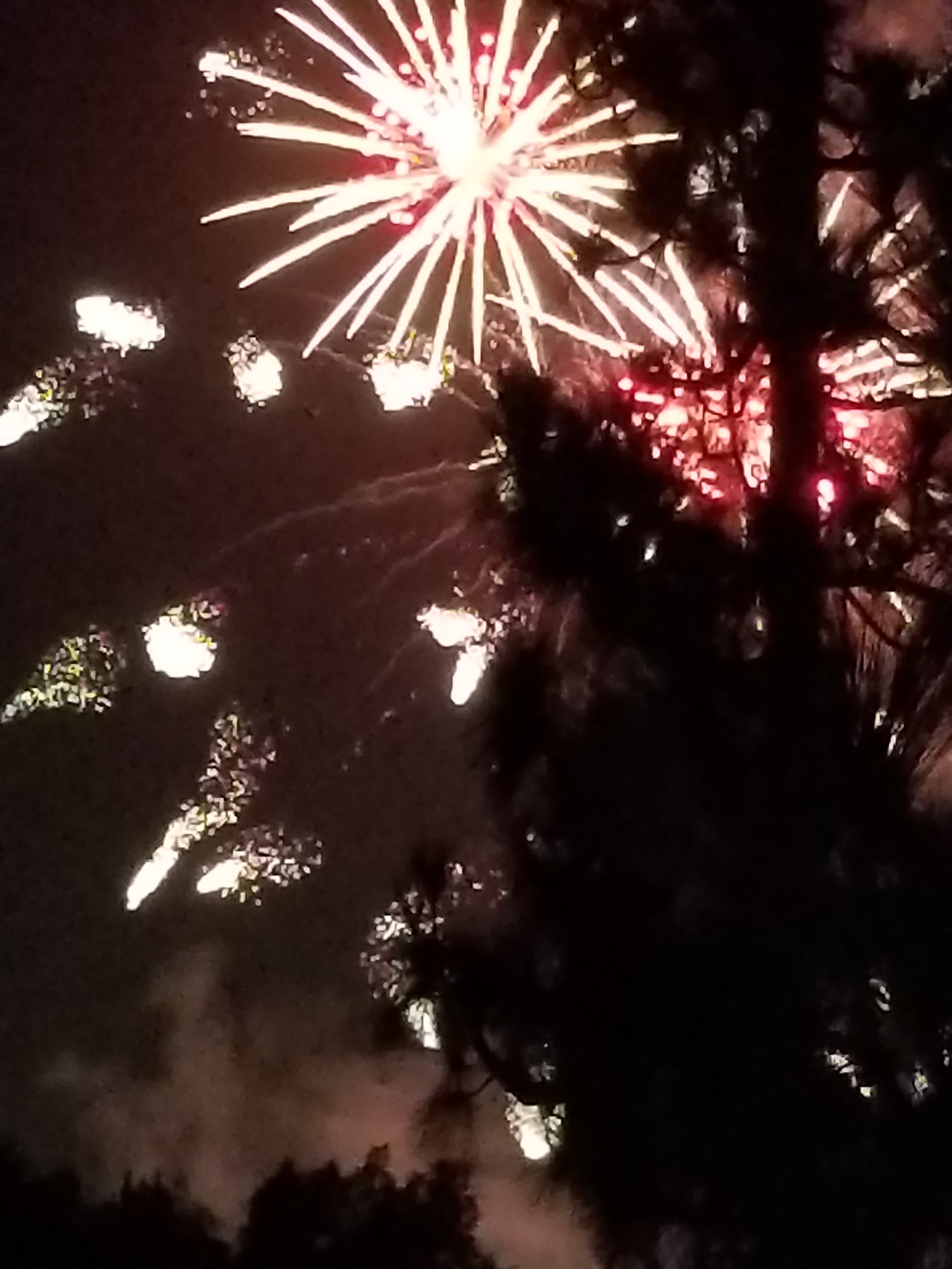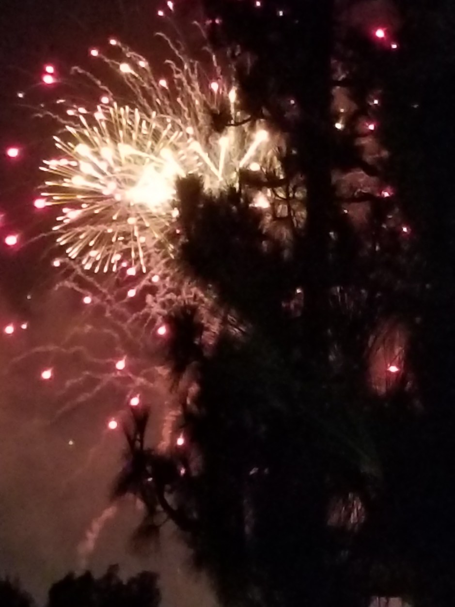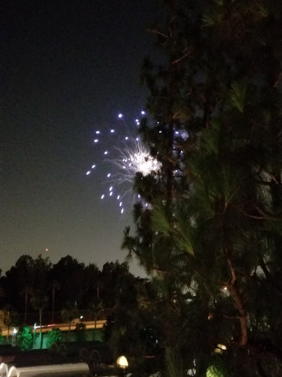 Then…we made it back to our room on time to watch the fireworks. Did I mention FROM OUR ROOM? Well we can though they did put us kind of behind a tree. We can still see most of it and hear the music though. If we walked down to the pool we would have had a better view.