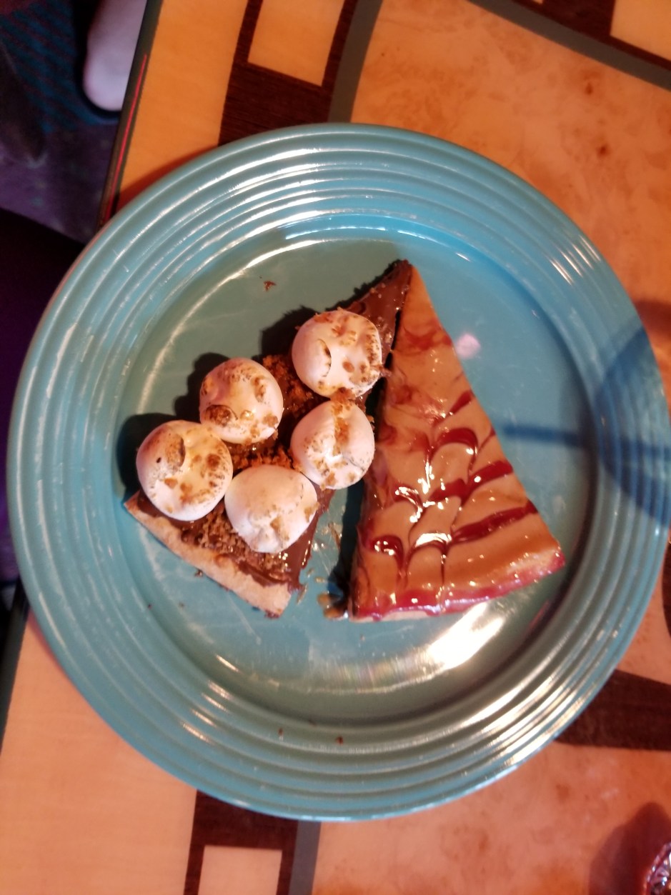 Peanut butter and jelly and s’mores pizza. What?? Good stuff.