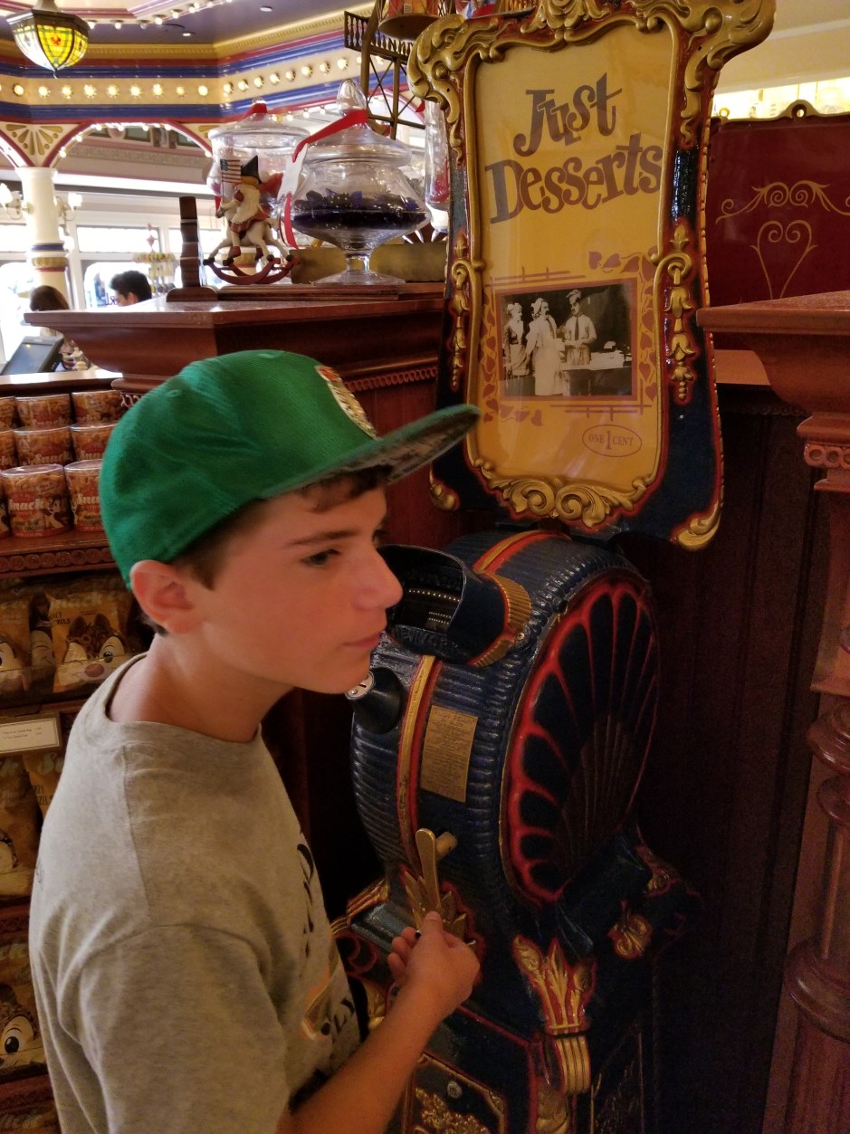 I love that Disneyland still has some of the old shops on Main St. The magic shop especially. The guy behind the counter demo’ed a few tricks for us and the boys were so impressed, they each bought a trick. I don’t know. It’s just cool they got something other than a stuffed animal. And this store just makes it feel like we are back in the early days on the Main St. Walt intended.