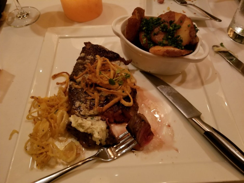 For an entree, it was mainly steak all around except Larissa got the lobster thurmadore and Carrie got the Heirloom tomato salad.