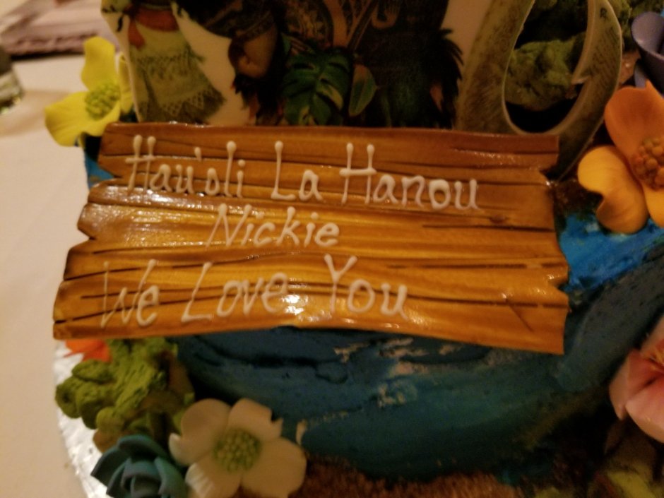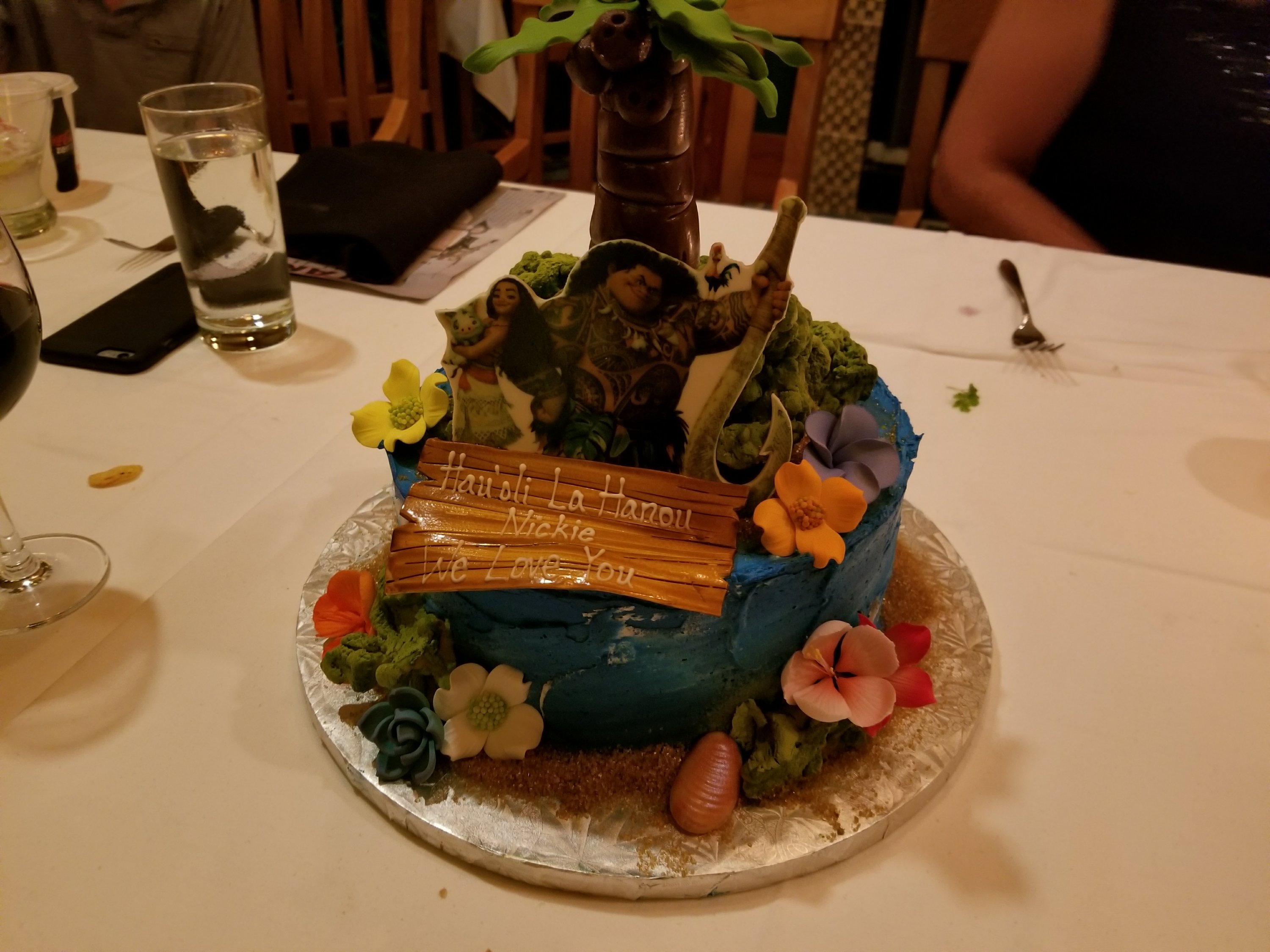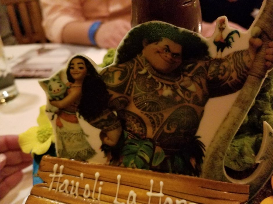 For dessert, I had ordered Nickie a custom Moana cake for her birthday so they brought it out to present it. And once again, the Disney team did a great job turning my vision into a reality.