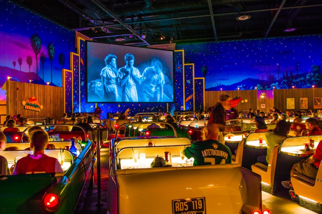 The plan is to have lunch that day in the park. Now, before we decided to completely eat outdoors, we made a lunchtime reservation at Sci-Fi Dine In Theater, which is a favorite of ours and a hard reservation to get these days. However, it’s technically inside. But also it looks like its outside, with diners in cars sitting in front of a drive-in movie screen.