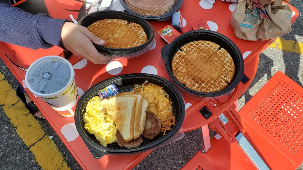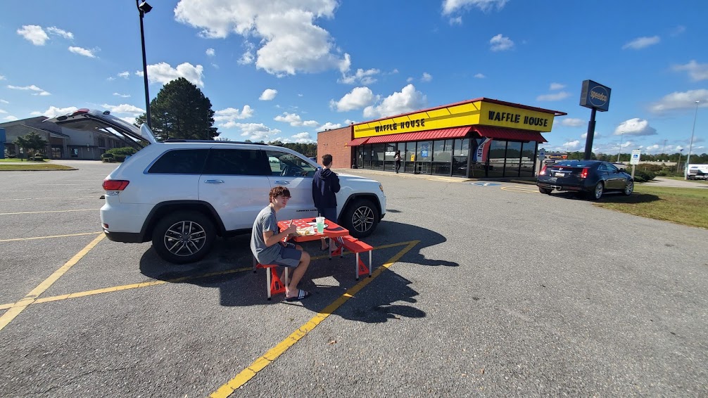 We have a hard time passing up Waffle House if its an option. Plus, the parking lot was empty. Which allowed us to use our nifty folding Minnie Mouse picnic table.