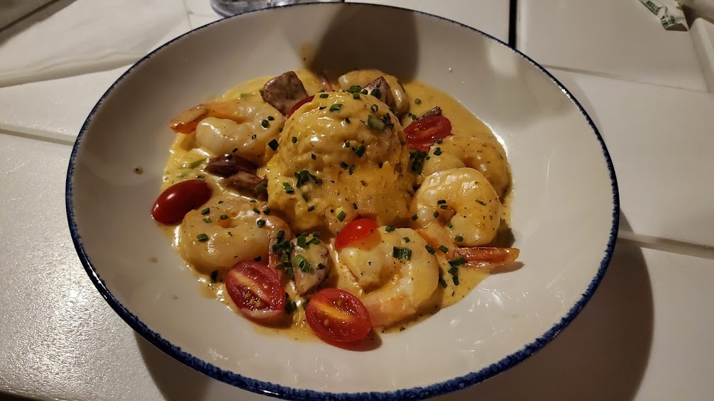 I ordered the Shrimp and Grits (Shrimp, Andouille Sausage, Chives, Grape Tomatoes, Stone-Ground Cheddar Grits, Cream Sauce.)