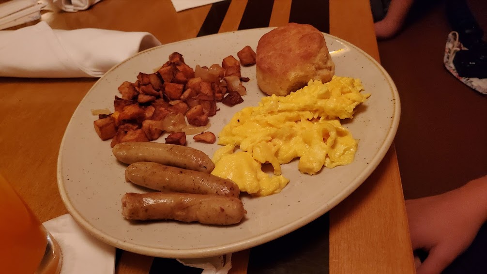 For their main plates, Myles and Owen both ordered the American (two eggs, sausage, biscuit, and breakfast potatoes.) Standard stuff, but they both seemed to enjoy it.