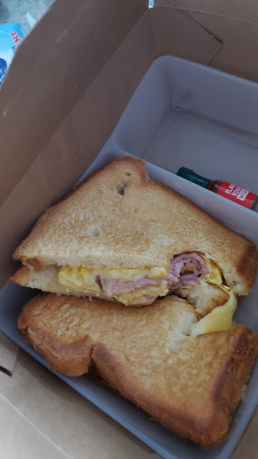 And soon enough, my food was bagged up and I brought it back to the room. Myles, Nickie, and I all got the Grilled Breakfast Sandwich (Egg, Ham and Three-Cheese Blend on Griddled Toasted Challah), which never disappoints.