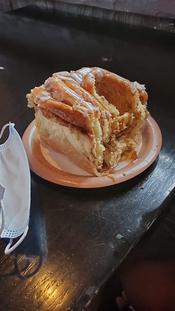 The boys went in and ordered their snacks while I hit the bathroom. When I got in and saw them sitting down, I saw that Owen got a cinnamon roll…