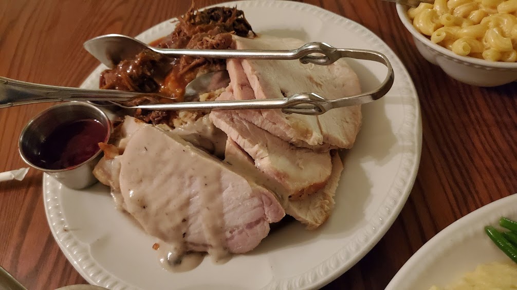 The main course is served family style. You get some Roasted Turkey Breast, Pot Roast, Oven-Roasted Pork, Herb Stuffing, Cranberry Sauce…