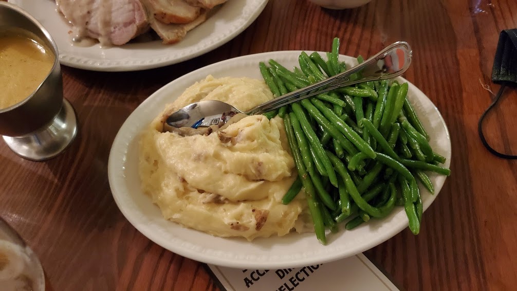 …Mashed Potatoes, Seasonal Vegetables (which were AMAZETOWN green beans)…
