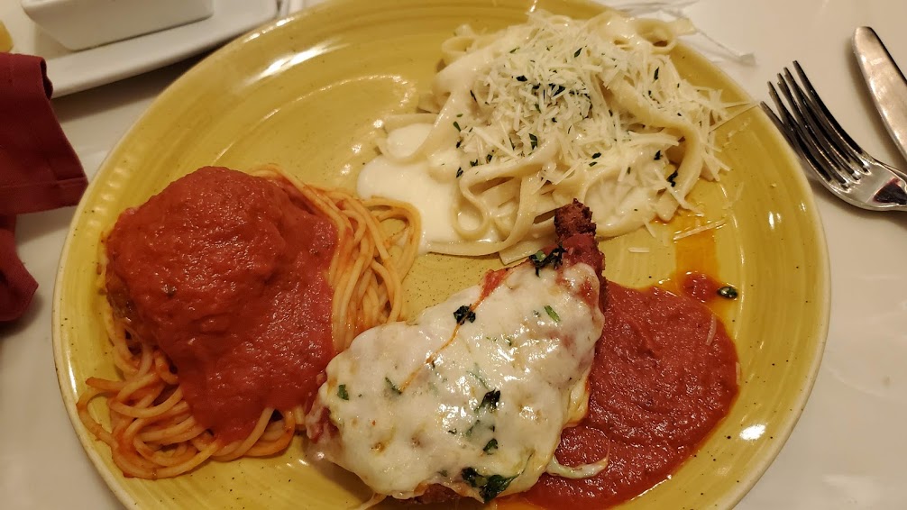 And Myles and I got the same thing. But It was a three-fer special of their most popular choices – Chicken Parm, Spaghetti and Meatball, and Fettucine Alfredo.