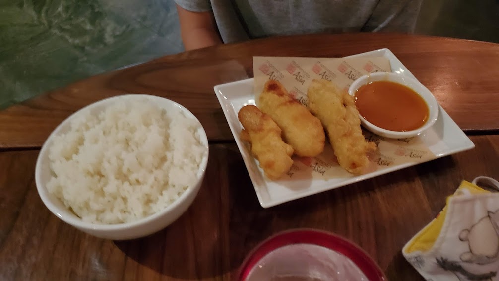 For his meal, Owen ordered the Kids’ Orange Chicken. The awesome thing about the kids’ orange chicken is that the orange sauce is served on the side. So Owen could choose as much or as little as he wanted to use. And it looks especially nice in a blurry photo.