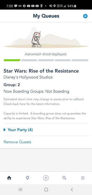 For those that don’t know, getting a boarding group to one of the newest (not THE newest) attractions in Disney’s Hollywood Studios is a bit of a complicated affair. These days, in order to ride Rise of the Resistance, one has to be part of a boarding group. And at the time we went, we could try, via the MyDisneyExperience app, to join a boarding group at two times a day – 7AM and 2PM. And we had heard these become unavailable…extremely quickly.