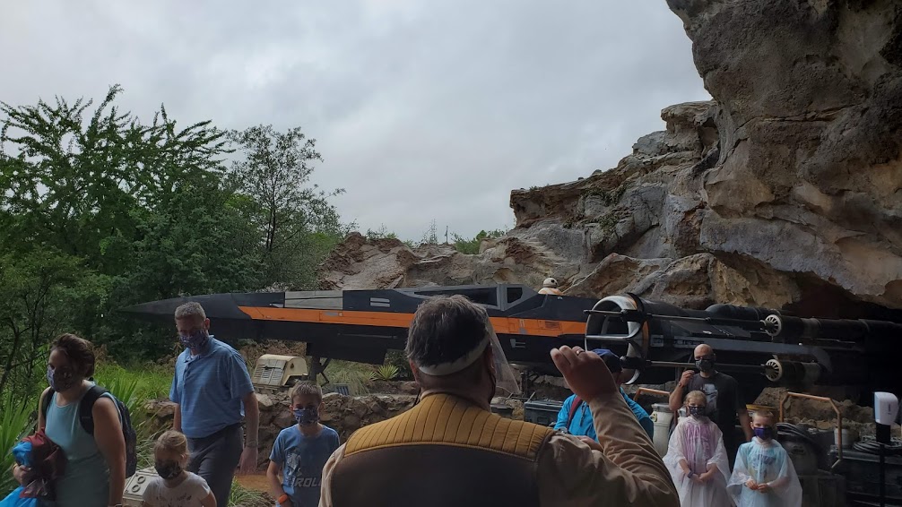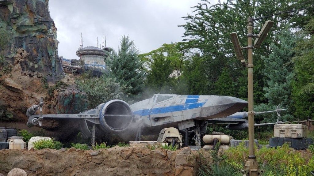 This attraction is really something. So first, we get the pre-show and our mission. And then, still part of the queue, we walk past Poe’s X-Wing…
