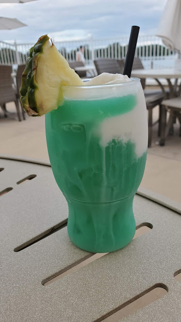 But sitting in hot water for that long works up quite a thirst. So we headed back over to the main pool and sat down at a table near the Beaches Pool Par & Grill.