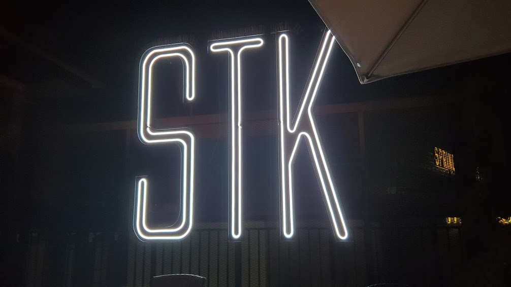 STK is sort of a hip steakhouse situation. Inside, they have a DJ that spins music and it’s a pretty loud affair. But out on the patio, things were pretty quiet. Which was nice. And they had this whole neon sign thing going on there. So still….hip.