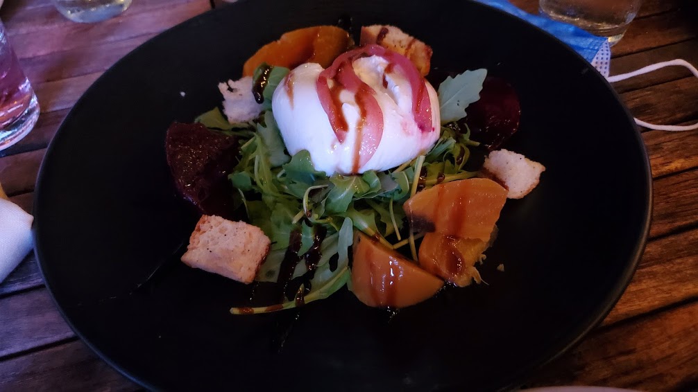 Also good-looking? This burrata (roasted beets, pickled shallots, extra virgin olive oil, crunchy sourdough) we started with.