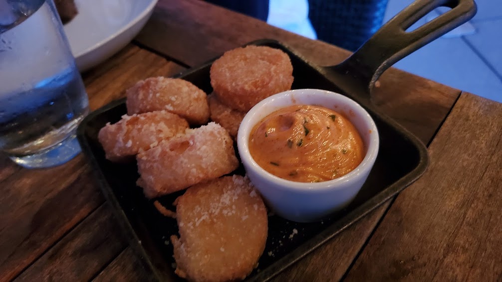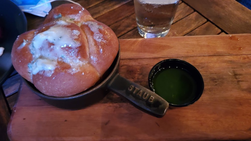 And in addition to our starter burrata, they also brought out this delicious pull-apart bleu cheese bread with chive oil.