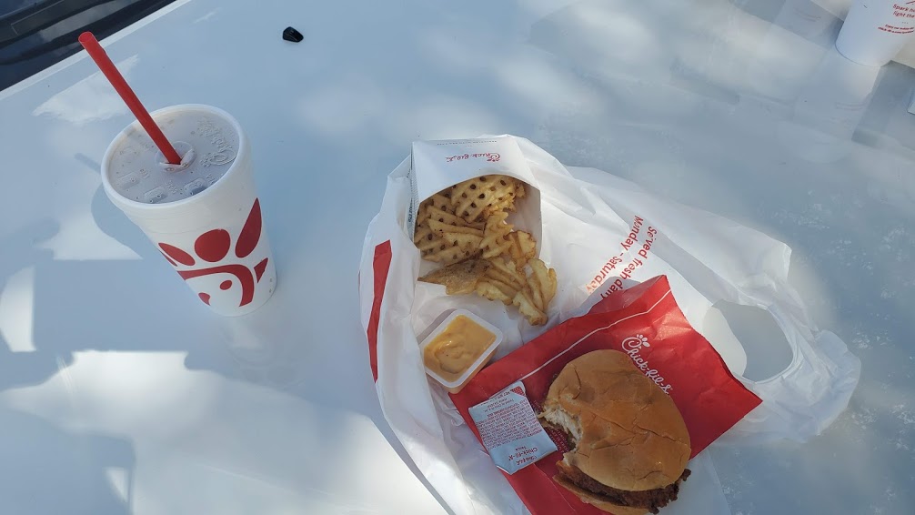 They brought out our food a few moments later. And we were then left to figure out where to enjoy our tasty treats. This was a special meal. We didn’t wanna just eat it in the parking lot of the Chik-fil-A.