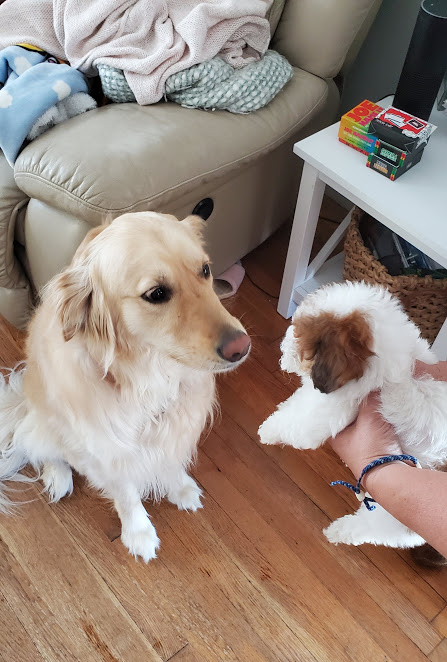 She has since warmed up to the little fluff ball and has actually become pretty protective of him. If he is outside trying to do his business and Lilo sees another dog coming down the street she goes nuts inside the house, wanting to get out there to get between the oncoming danger and Stitch. And while yeah, she does occasionally leave the scene if she has had enough of him but I have also seen her play with him and even bring him some of her own toys to play with.