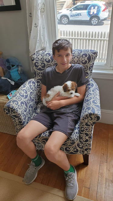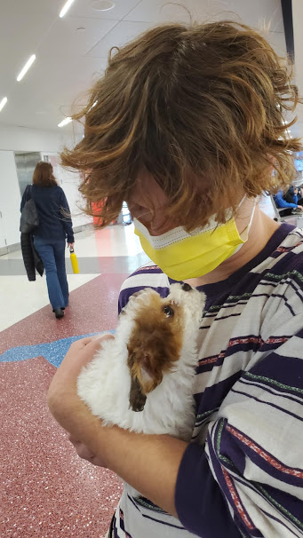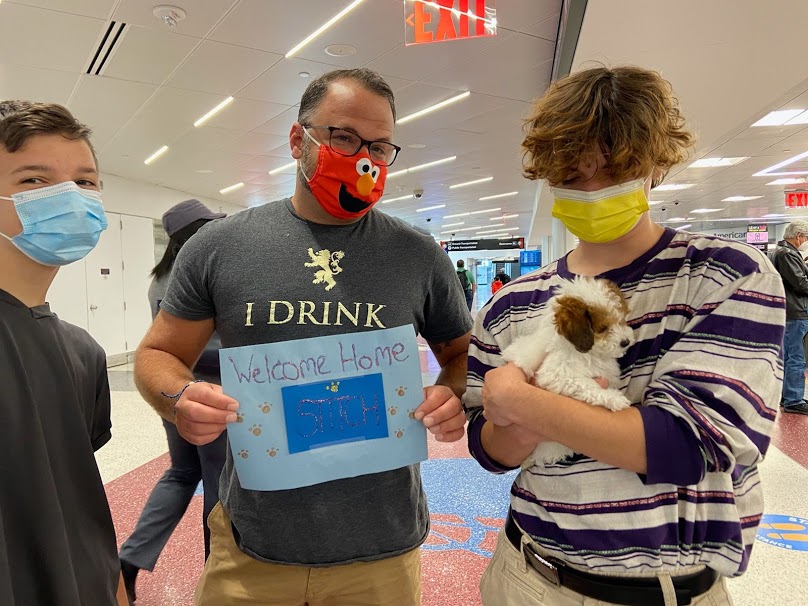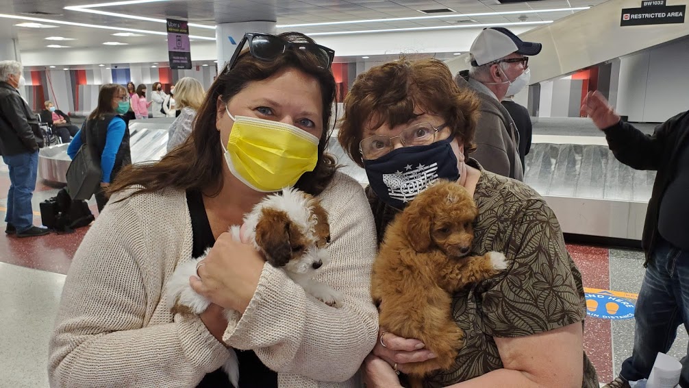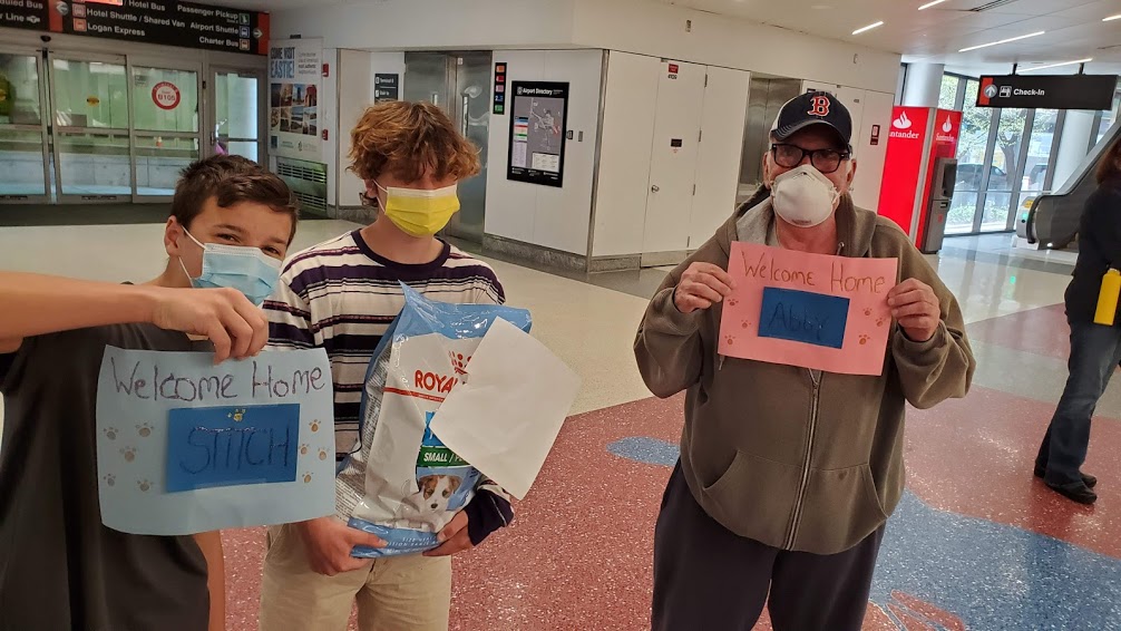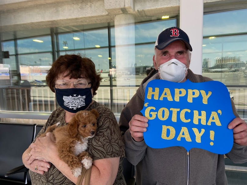 We officially took Stitch home on April 20th, 2021. It was a Tuesday. The breeder was coming in on an 11ish AM flight and since we were both in Massachusetts, Sharon and Alan could also meet us at the airport to get Abby. Bonus? It was their anniversary as well.