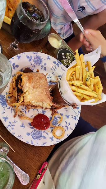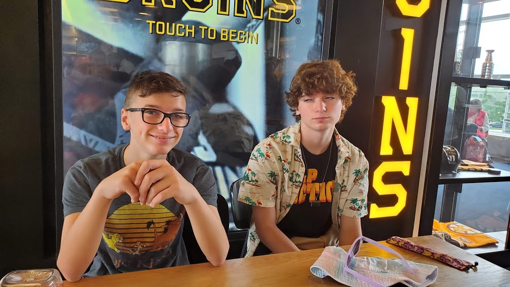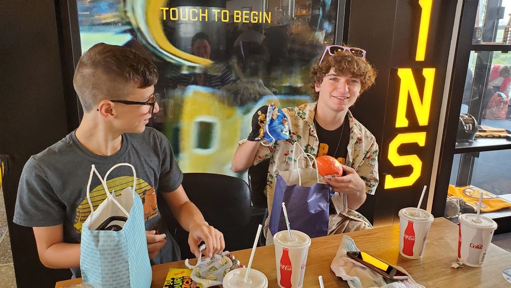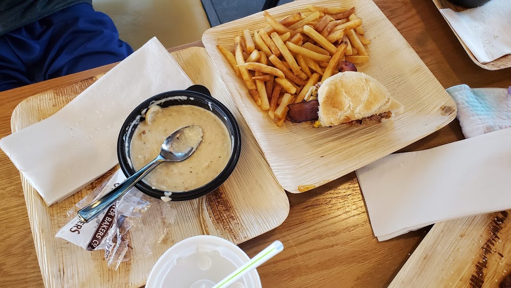 For their lunch, the boys each got a bowl of chowder and split a bacon cheeseburger.