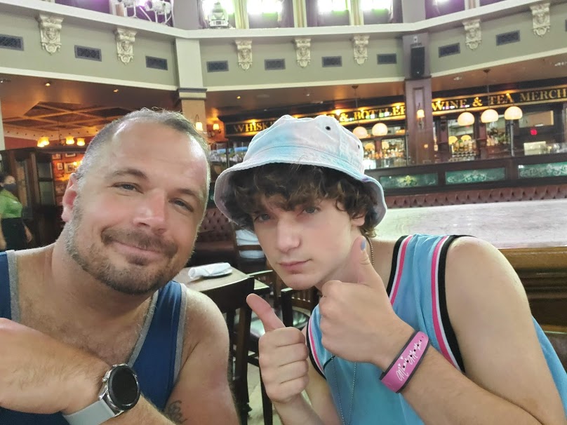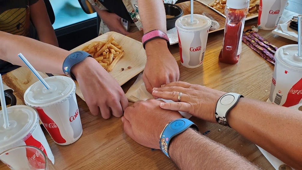 In lieu of a chicken sandwich pic, here’s one of us gearing up for our trip “Wonder Twins Style.” Magic bands, activate!