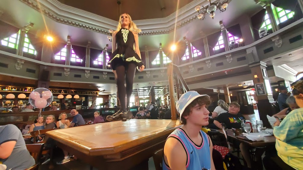 While the band was playing, one of the Irish step dancers moved over to RIGHT NEXT TO MYLES’S HEAD.