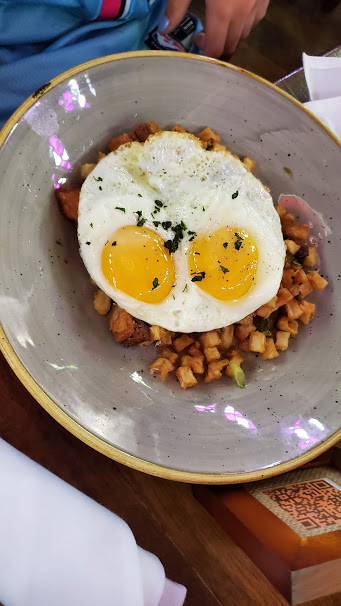 Myles was the only one that got anything remotely brunchy for his meal, choosing the Pork Hash Tagged (Braised pork belly, scallions and potato hash topped with two fried eggs.)