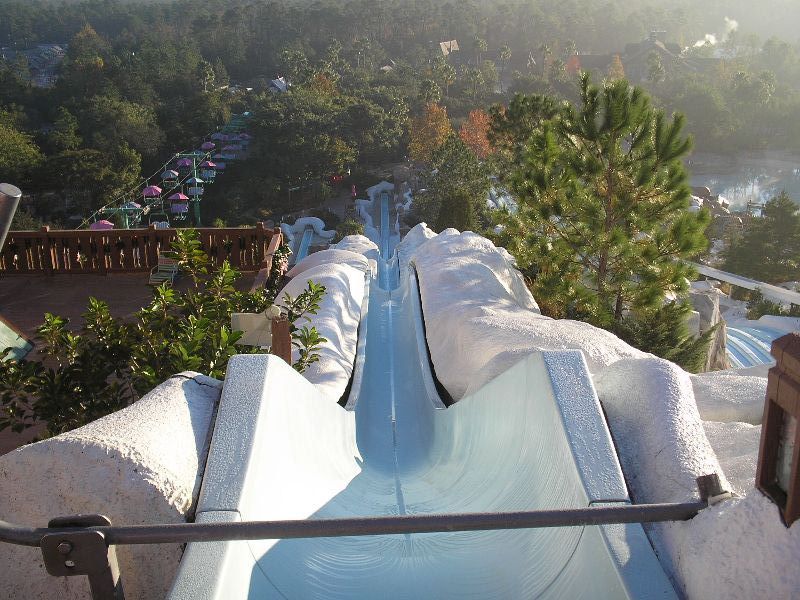 Located next to Summit Plummet, Slush Gusher is an undulating body slide that, honestly, was a tad more terrifying than Summit Plummet. It has two dips and a 90-foot drop. The drop is whatevz. But that second dip is rull scurry. You get all kinds of air at that point.