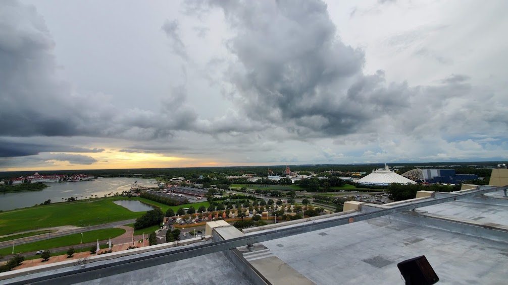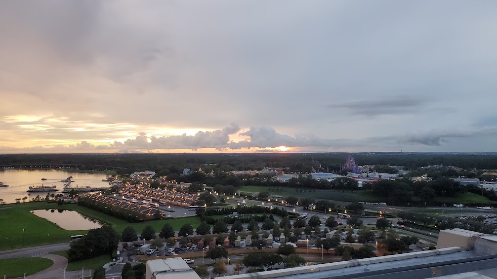 In between our entrée and our dessert, the sun had started to go down so we wanted to get back out on the observation deck to get a look at the sunset and the lights coming on at Magic Kingdom and beyond.