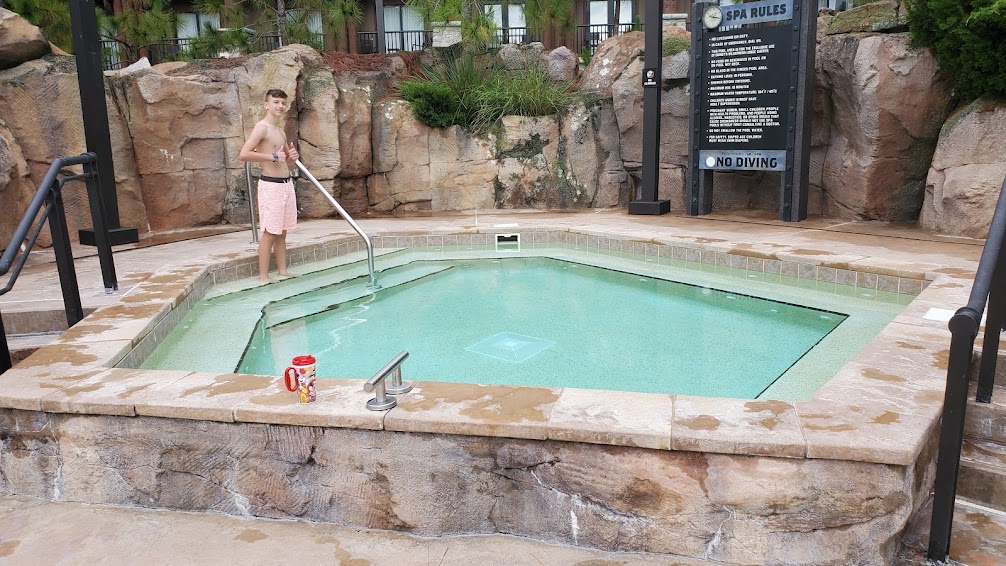 Back in this universe, though, the rain did start to slow by the time we got back to our room so we threw our suits on real quick to take a dip in the Boulder Ridge hot tub before getting ready for the night.