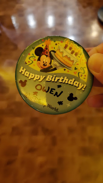 I also grabbed Owen a free birthday button from the front desk. And I don’t know…because COVID, maybe? They had me write Owen’s name on it myself.