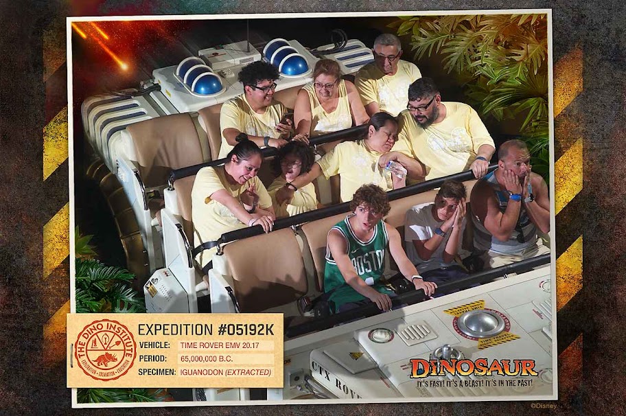 The wait time for DINOSAUR wasn’t too bad at all. We got in line at 9:48AM and were on our time rover by 9:56. That’s an 8-minute wait for my math-challenged readers. And that included the just-back-from-its-COVID-break pre-show with Mrs. Huxtable.