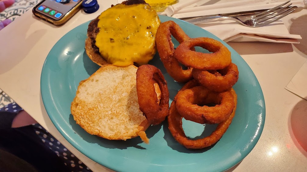Nickie ordered the Angus Beef Burger with Cheese and a side of onion rings.
