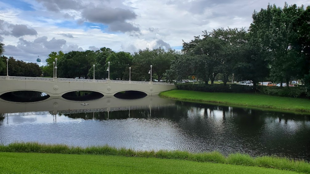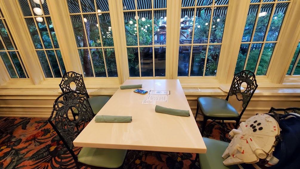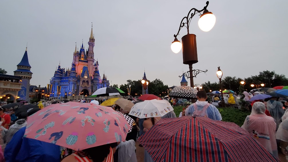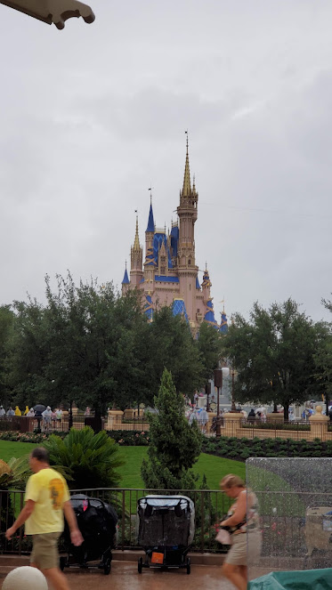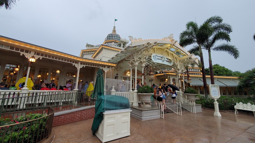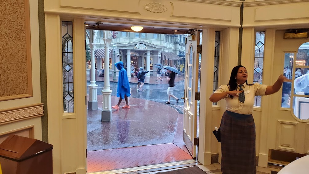 The windows offered us a nice view of the bridge to Adventureland and the water nearby, which was both comforting (because of the drops of rain calmingly falling against the water) and hilarious (because of all the Disney guests getting soaked.)