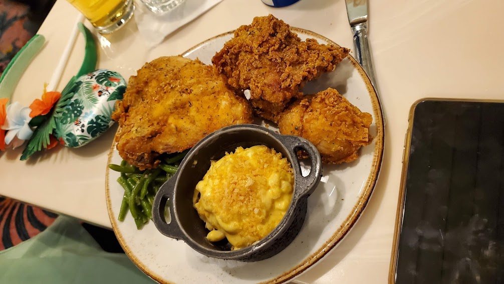 For their entrees, Nickie and Owen got the same thing – The Crispy Fried Chicken with Panko-topped Macaroni and Cheese and Green Beans.