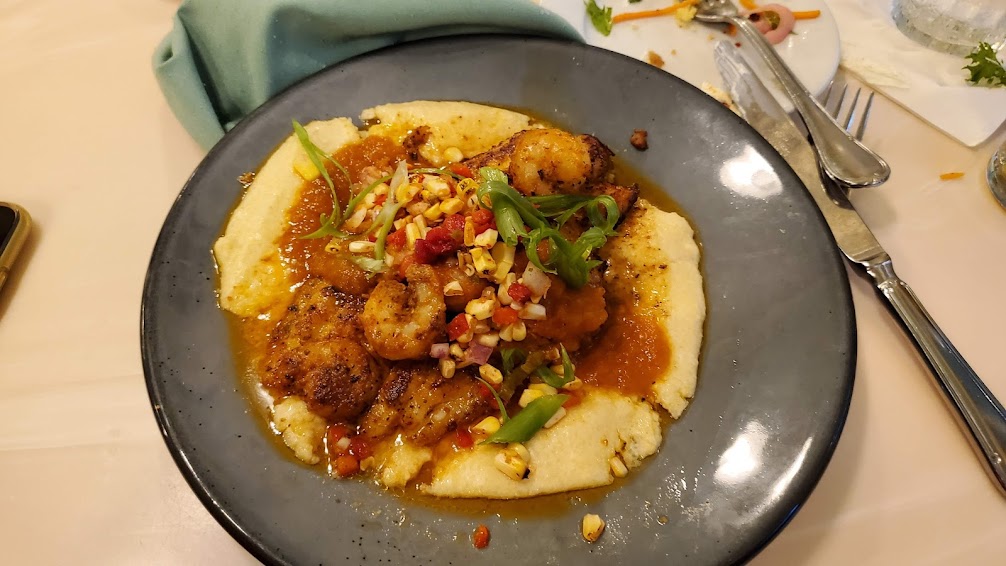 For my entrée, I asked our server what he recommended and he said, no question, to go for the Blackened Catfish and Shrimp with Creamy Cheddar Grits, Fire-roasted Corn Salsa, and Sauce Creole.