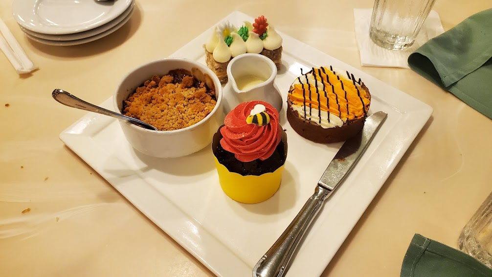 As mentioned, dessert was a shared affair. Tonight, we were served Peach Cobbler, Banana Cream Pie, Hummingbird Cake, and a “Honey of a Chocolate” Cupcake.