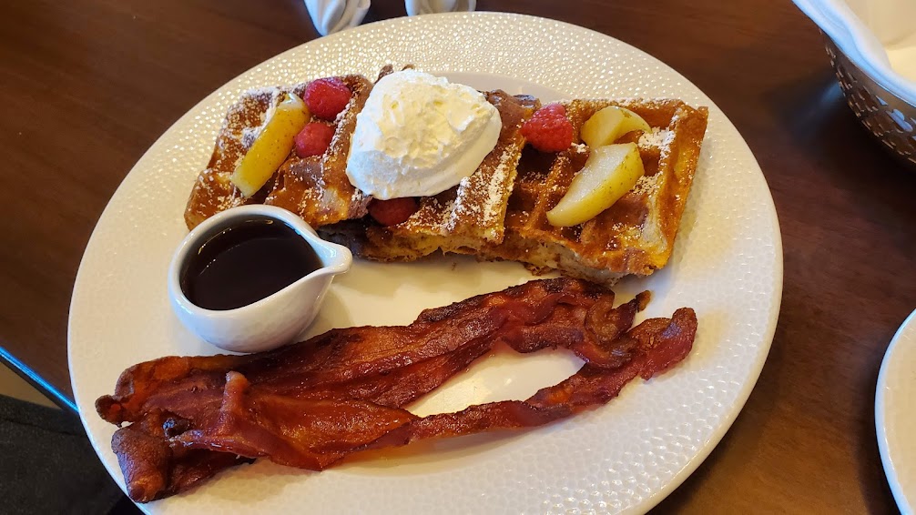 Myles got the Sour Cream Waffle with Roasted Apple, Chantilly, Orange-Maple syrup with a side of smoked bacon.