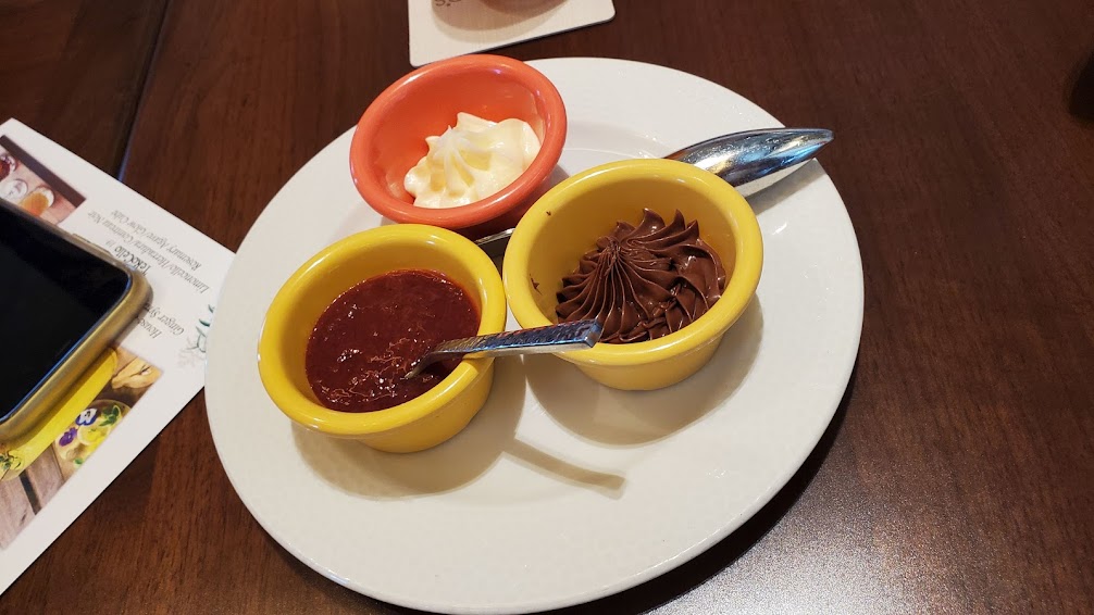 House-made jam, honey butter, and Nutel…sorry, chocolate-hazelnut spread.