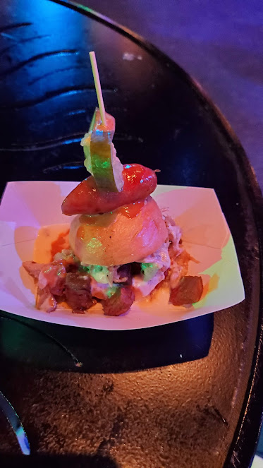Behold. The Beef Brisket Burnt Ends and Smoked Pork Belly Slider with Garlic Sausage, Chorizo, Cheddar Fondue, and House-made Pickle.