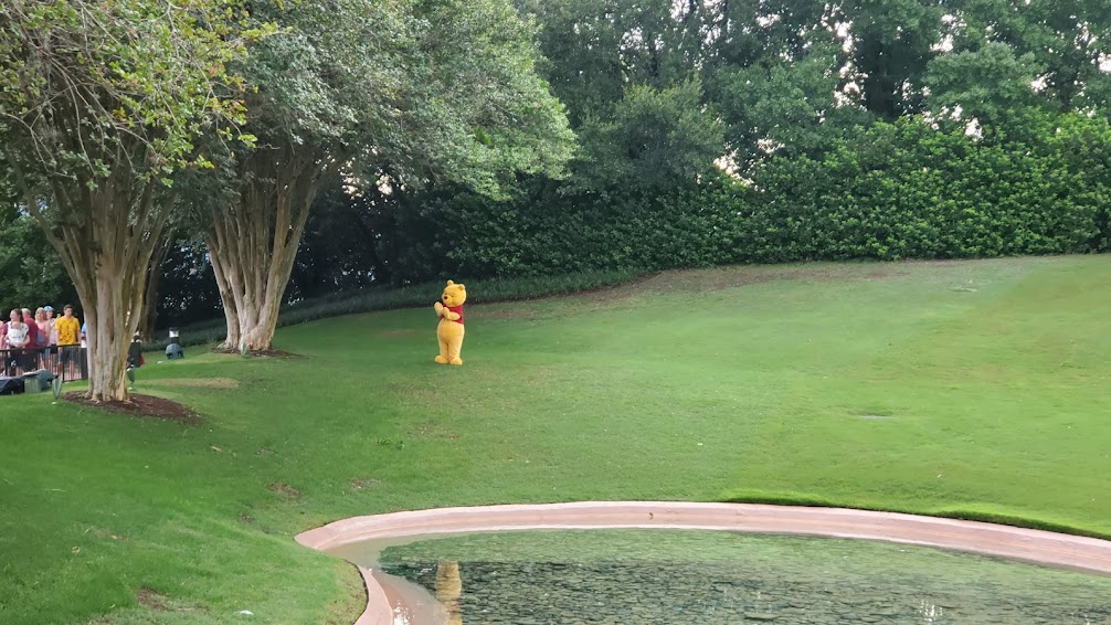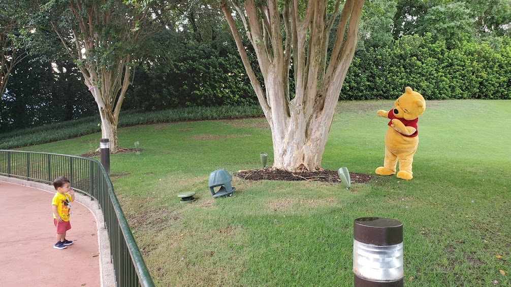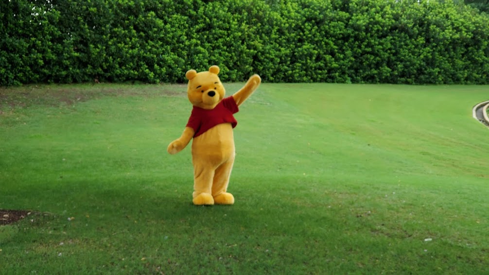 Pooh would hide behind the tree and then jump back out while the little boy kept putting his hands over his eyes and removing them, in like a peek-a-boo scenario type of thing.