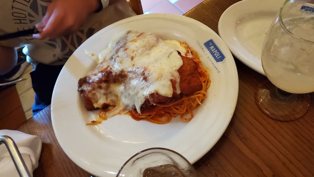 For his entrée, Myles ordered the Chicken Parmesan over spaghetti, which he seemed to enjoy…