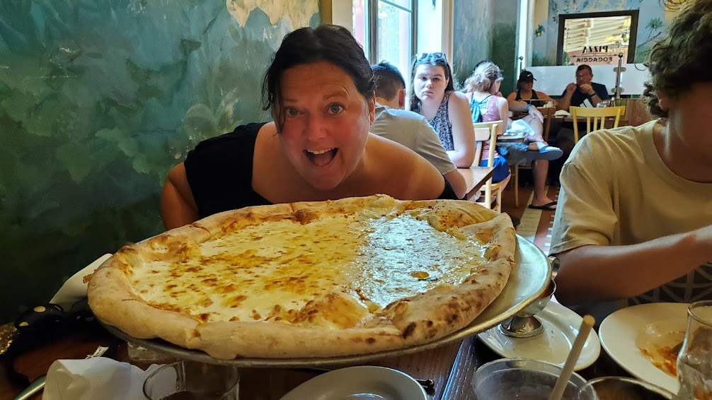 Nickie and I also ordered a pizza to share – the Quattro Formaggi. A white pizza with mozzarella, parmesan, fontina, provolone. Look at the size of this thing.