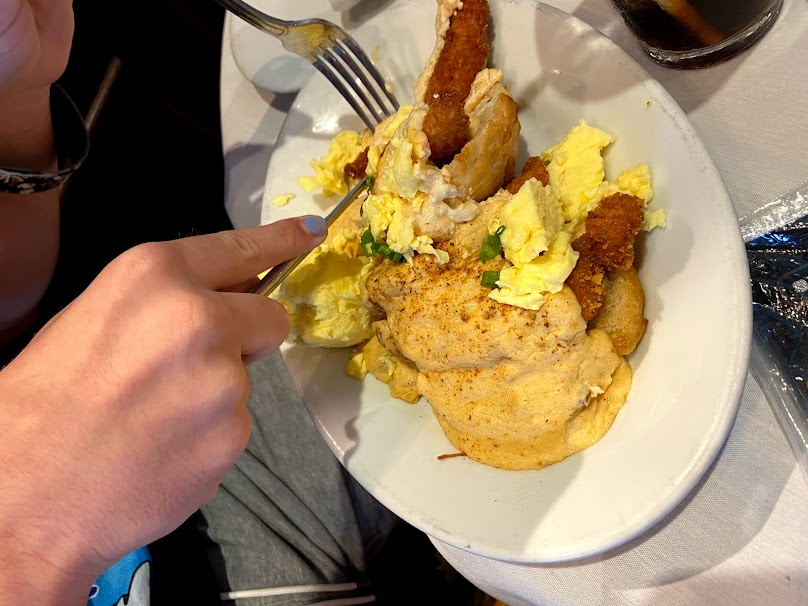 While this was technically brunch, Myles was the only one of us that ordered anything remotely breakfast-y. He got the Chicken Biscuit & Gravy (Buttermilk Biscuit, Creole-Onion Gravy, Panko Chicken Tenders, Two Eggs any style).