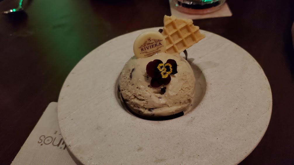 Made with Knob Creek Rye Whiskey, Appleton Estate Reserve Blend Rum, Vanilla Bean, and Bitters, this was a real nice drink. And you can’t see it in that picture, but that ice cube? It had an “R” on it. For the Riviera. So you know, it was a pretty fancy ice cube.