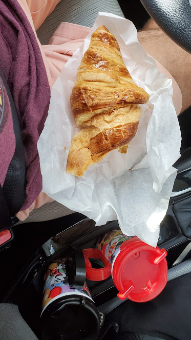 The two of us were ready and out the door by 8:45. On our way to the car, we stopped at BoardWalk Bakery to refill our mugs and grab some almond croissants for the road.
